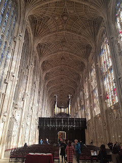 One of our first stops was King's College and the King's College Chapel. The Chapel, which was completed in the 1530s, features the world's largest fan vault ceiling and the largest amount of Renaissance stained glass in one place, anywhere in the world! The wooden choir screen in the middle of the church was commissioned by Henry VIII for Anne Bolelyn, his second wife. She was beheaded before the screen was completed, but it still bears the letters R.A. for Regina Anne -- Queen Anne.